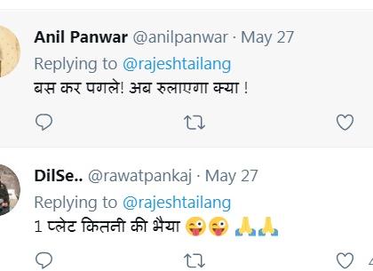 ‘वकालत से सीधे इस धंदे में घुस गए गुरू?’ अशी प्रतिक्रिया एका चाहत्याने यावर दिली आहे. बस कर पगले, अब रूलाएगा क्या, अशी मजेदार प्रतिक्रिया एका युजरने दिली आहे. 1 प्लेट कितनी की भैय्या, असा सवाल एका युजरने केला आहे. अभी स्टोर कर के रखी लीजिये..., लॉकडाऊन खुलने पर ब्लॅक मे बेचना, असा अजब सल्ला एका युजरने त्यांना दिला आहे.