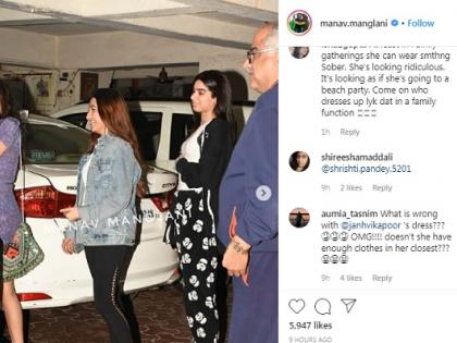 किमान फॅमिली फंक्शनमध्ये तरी साधे कपडे घालावेत ना. असे वाटतेय, जणू जान्हवी कुण्या बीच पार्टीला जातेय, अशी प्रतिक्रिया एका युजरने तिचा हा ड्रेस पाहिल्यानंतर दिली. जान्हवी कपूरला हे काय झाले. तिच्याकडे दुसरे कुठले कपडे नव्हते काय? अशा शब्दात एका युजरने तिला ट्रोल केले.