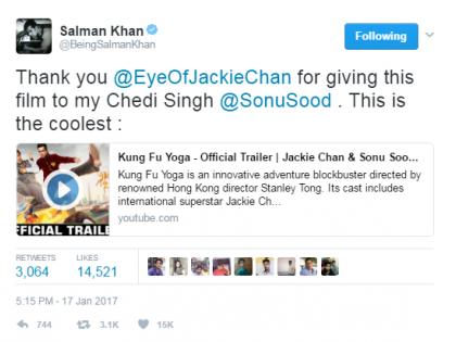 कुंग फू योगाचा आॅफिशिअल ट्रेलर सलमान खानच्या ट्विटर अकाऊंटवरून रिलीज करण्यात आला आहे. सलमानने आपल्या ट्विटर अकाऊंटवर लिहिलेय, ‘धन्यवाद जॅकी चेन हा चित्रपट माझ्या छेदी सिंग (सोनू सूद) ला देण्यासाठी, सर्वांत कुल आहे.’ कुंग फू योगा या चित्रपटात सोनू सूद खलनायकाची भूमिका साकारताना दिसेल. या चित्रपटात दिशा पटणी व जॅकी चेन मुख्य भूमिकेत असून आयमारा दस्तूर हिची महत्त्वाची भूमिका आहे. चीनमध्ये २६ जानेवारीला तर भारतात ३ फेब्रुवारीला हा चित्रपट प्रदर्शित होणार आहे.