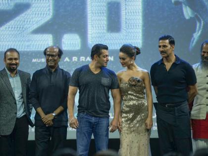 फोटो :2.0 च्या टीजर रिलीजच्या वेळी उपस्थित सुपरस्टार रजनीकांत, सलमान खान, अॅमी जॅक्सन व अक्षय कुमार
