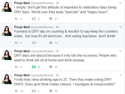 पूजा बेदी हिने ट्विट करून आपले मत मांडले आहे. पूजा म्हणाली, ‘‘त्यांनी दारू पिण्यासाठी वयाची अट वाढवून २५ केली आहे. त्यानंतर त्यांनी मतदानाचा दिवस ड्राय डे ठरवला आहे. भारतीय नागरिक गुंड आणि बेजबाबदार आहेत असे सरकारला वाटते का ? ड्राय डे हास्यास्पद प्रकार आहे कारण याचा आर्थिक फटका आपल्या अर्थव्यवस्थेला बसतो. ज्या लोकांना दारू प्यायची आहे ते घरी बसून पिऊ शकतात,’’ आपल्या मताला दुजोरा देत पूजा म्हणते, ‘‘गंमत म्हणजे मतमोजणी आणि निकालाचा दिवसही ड्राय डे असतो. मतमोजणी सुरळीत पार पडावी म्हणून हे केल्याचे सांगितले जाते. पण आता सर्व इलेक्ट्रॉनिक आहे आणि व्होटिंंग मशीन्स दारू घेत नाहीत.’’