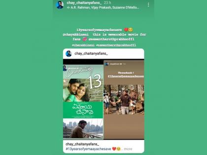 समांथाने आपल्या करिअरची सुरुवात तेलुगु चित्रपट 'ये माया चेसावे'मधून केली होती. या चित्रपटाला रिलीज होऊन १३ वर्षे पूर्ण झाली आबेत. या चित्रपटात तिची जोडी नागा चैतन्यसोबत होती, जी प्रेक्षकांना खूप आवडली होती आणि हा चित्रपटही ब्लॉकबस्टर ठरला. पहिल्यांदाच या स्टार्सची जोडी चित्रपटाच्या पडद्यावर आली आणि प्रेक्षकांनीही त्यांना भरभरून प्रेम दिले. या चित्रपटाला 13 वर्षे पूर्ण झाली आहेत, त्यानिमित्ताने नागा चैतन्यने त्याच्या इंस्टाग्राम अकाउंटवर चित्रपटाशी संबंधित काही पोस्टर्स शेअर केले आहेत.
