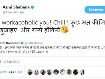 ब लिवूड महानायक अमिताभ बच्चन सोशल मीडियावर कमालीचे सक्रीय आहेत. सोशल मुद्यांपासून, स्वत:च्या पर्सनल लाईफबद्दलचे अपडेट्स ते सोशल मीडियाच्या माध्यमातून आपल्या चाहत्यांना देत असतात. आपल्या ताज्या tweetमध्ये अमिताभ यांनी कसले अपडेट्स दिले असेल? काही अंदाज? अहो, काम लवकरच संपल्याचे. होय, अचानक काम लवकरच संपले की, पुढे काय करावे, ते कळत नाही. twitter आणि एफबी जिंदाबाद, असे tweetत्यांनी केले. त्यांच्या या संभमावर अनेकांनी मनात येईल तसे उत्तर दिले. पण यात सगळ्यांत एका अभिनेत्रीच्या उत्तराने मात्र सगळ्यांचे लक्ष वेधले. ही अभिनेत्री कोण ? तर शबाना आझमी. होय, शबाना यांनी अमिताभ यांना चांगलेच मजेशीर उत्तर दिले.
