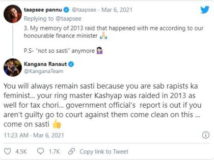 ट्विटच्या माध्यमातून तापसीने कंगना रणौतवर अप्रत्यक्षपणे निशाणा साधला होता त्यावर कंगनानेही ट्विट करत तिला प्रत्युत्तर दिलं आहे. 'तू नेहमी स्वस्तच राहणार म्हणत तिने अनुराग कश्यपवरही निशाणा साधला आहे. सध्या कंगणाचे हे ट्विट तुफान व्हायरल झाले आहे. तुम्ही निर्दोश आहात असे वाटत असेल स्वतःला सिद्ध करुन दाखवा, कोर्टात जा. तेथून क्लिन चीट मिळवा. कमऑन सस्ती'