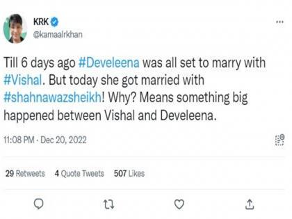 काही दिवसांपूर्वीच केआरकेनं देवोलिना व शाहनवाजच्या लग्नाबद्दल ट्वीट केलं होतं. ‘6 दिवासांपूर्वीपर्यंत देवोलिना विशालशी लग्न करण्यासाठी तयार होती. पण आज तिने अचानक शाहनवाजशी लग्न केलं. का? नक्कीच विशाल आणि देवोलिना यांच्यात काहीतरी बिनसलं,’असं त्याने आपल्या ट्वीटमध्ये म्हटलं होतं.