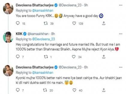 यावर देवोलिनानेही उत्तर दिलं होतं. ‘तू खरंच खूप मजेशीर आहेस केआरके. तुझा दिवस चांगला जावो,’ असं तिने लिहिलं होतं.