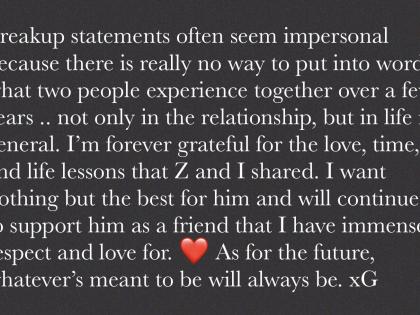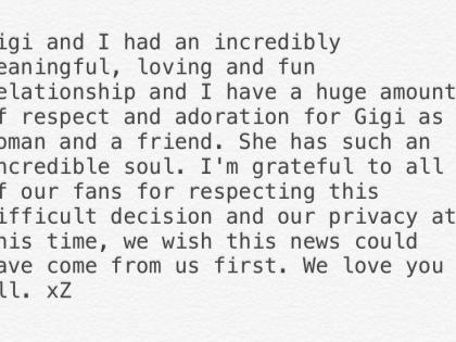 जीजीनेदेखील तिच्या ट्विटरवर लिहिले की, अपेक्षा करते की, जायनला आपल्या आयुष्यात सर्वात चांगल्या गोष्टी मिळाल्या असतील. मी एक मैत्रीण म्हणून त्याला पुढच्या काळातही सपोर्ट करणार आहे. कारण आजही माझ्या मनात त्याच्याबद्दल आदर आणि प्रेम आहे. दरम्यान, जायन आणि जीजी त्यांच्यातील नात्यामुळे नेहमीच चर्चेत राहायचे. जीजी एक अमेरिकन मॉडेल आहे तर जायन एक गायक आहे. दोघेही रिलेशनशिपमध्ये होते, तेव्हा सातत्याने त्यांच्यातील नात्याची सोशल मीडियावर चर्चा रंगायची. दोघांनी नेहमीच एकत्र राहावे, अशी त्यांच्या चाहत्यांची अपेक्षा होती.