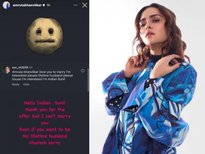 अभिनेत्री अमृता खानविलकर हिने इंस्टाग्रामवर चाहत्याने केलेल्या मेसेजचा स्क्रीनशॉट शेअर केला आहे आणि त्याच्या प्रश्नाचे उत्तरही दिले आहे. त्या चाहत्याने लिहिले की, अमृता खानविलकर, मला तुझ्याशी लग्न करायला आवडेल. मी इंटरेस्टेड आहे. प्लीज कायमस्वरुपी नवरा. मी इंटरेस्टेड आहे. मी इंडियन सुनील. या चाहत्याच्या मेसेजवर अमृताने लिहिले की, हॅलो इंडियन सुनील. मला ही ऑफर दिल्याबद्दल मी आभारी आहे. पण मी तुझ्यासोबत लग्न नाही करू शकत. जरी तुला कायमस्वरुपी नवरा व्हायचे असेल तरी. खरंच सॉरी. कलाकारांना अनेकदा चाहत्यांच्या अशा मागण्यांना सामोरे जावे लागते. मात्र अमृताने त्या चाहत्याला योग्य उत्तर देत त्याचा हा प्रस्ताव नाकारला आहे.
