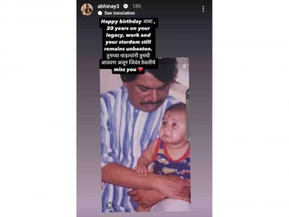 लक्ष्मीकांत बेर्डे यांचं निधन झालं तेव्हा अभिनय अगदीच लहान होता. बाबांसोबत लहानपणीचा फोटो शेअर करत अभिनयने लिहिले, "हॅपी बर्थडे आबा. तुझ्या कामाचा आणि प्रसिद्धीचा २० वर्षांचा वारसा आजही तसाच आहे. तुमच्या चाहत्यांनी तुमची आठवण अजून जिवंत ठेवलीये. miss you."