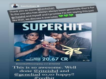 'वेड' हा मराठी सिनेमा ३० डिसेंबर रोजी प्रदर्शित झाला. अवघ्या एका आठवड्यात सिनेमाने धुमाकूळ घालत २३ कोटींचा गल्ला जमवला आहे. मराठी चित्रपटाची ही कामगिरी नक्कीच कौतुकास्पद आहे. बॉलिवूड अभिनेता अभिषेक बच्चनही 'वेड'चे कौतुक करण्यापासून स्वत:ला थांबवू शकलेला नाही. वेडच्या कमाईचा फोटो पोस्ट करत त्याने रितेश आणि जिनिलियाचे कौतुक केले आहे. वेड हिट असेही त्याने म्हणले आहे.