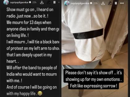 सुप्रिया पिळगावकर यांनी शेअर केलेल्या पोस्टमध्ये लिहिले की, “शो मस्ट गो ऑन. मी ही दुःखद बातमी रेडीओवर ऐकली. आपल्या कुटुंबातील एखाद्या व्यक्तीचे निधन झाले तर, आपण १३ दिवस दुखवटा पाळतो, शोक व्यक्त करतो. मी आता माझा शोक व्यक्त करणार आहे. मी पुढचे १३ दिवस माझ्या हाताला काळी पट्टी बांधून मला मनातून किती दुःख झालं आहे, हे सांगणार आहे.” यासोबतच त्यांनी सगळ्यांना आवाहन करत पुढे लिहिले की, “तुम्हीही माझ्यासोबत हाताला काळी पट्टी बांधून आपला शोक व्यक्त करू शकता.”