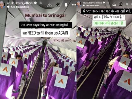 अतुल कुलकर्णीने सोशल मीडियावर चार फोटो शेअर केले आहेत. यात अतुल कुलकर्णीने इन्टाग्रामवर चार स्टोरी शेअर केल्या आहेत. अतुल कुलकर्णीने फ्लाइटमधील फोटो शेअर केले आहेत. उन्हाळी सुट्ट्यांमध्ये हाउसफुल्ल असलेली विमानं आज रिकामी आहेत. त्यामुळे अतुल कुलकर्णी लिहितो की, "चला, काश्मीरला!, विमानं माणसांनी भरभरुन काश्मीरला जात होती. या विमानांना पुन्हा भरायचं आहे. आतंक को हराना है", अशा शब्दात पोस्ट करुन अतुल कुलकर्णीने विमानप्रवासाचा अनुभव सांगितला. याशिवाय काश्मीरला पुन्हा सर्वांनी न घाबरता बिनधास्तपणे जावं, असं आवाहन केलंय.