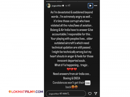पुष्कर जोगने अत्यंत संतप्त आणि भावनिक पोस्ट शेअर केली आहे. या पोस्टमधून केवळ दु:खच नव्हे तर विमान वाहतूक व्यवस्थेतील ढिसाळपणावर थेट सवाल उपस्थित करण्यात आले आहेत. त्यानं लिहिलं, "मी सुन्न आहे, नि:शब्द झालोय.. पण एक सांगतो मी अत्यंत संतप्तही आहे. या देशात विमान वाहतुकीचे सर्व नियम धाब्यावर बसवणारी भ्रष्ट लोक. Boeing आणि Air India यांनी या दुर्घटनेवर उत्तर दिलं पाहिजे आणि जबाबदारी घेतलीच पाहिजे. लोकांच्या जीवाशी खेळ जात आहे".