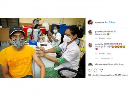 वाघाला सुई टोचली,बाई फारच शूर वीर आहेत, तुमच्या बरोबर लस घेण्याचा योग आल्याने anti bodies डबल खुश झाल्या अशा भन्नाट कमेंट्स चाहते अमेयच्या फोटोवर करतायेत. फोटो शेअर करताना
