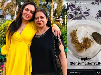 अभिनेत्री अमृता खानविलकर सोशल मीडियावर सक्रीय असून ती माध्यमातून ती चाहत्यांना अपडेट देत असते. नुकतेच तिने इंस्टाग्राम स्टोरीवर एका पदार्थ खात असतानाचा व्हिडीओ शेअर केला आहे. त्यात ती पिन्नी हा पदार्थ खात आहे, जो तिच्या सासूबाई म्हणजेच अंजू मल्होत्रा यांनी बनवला आहे. यात अभिनेत्री म्हणतेय की, माझ्या सासूजींनी बनवलेली पिन्नी. आतापर्यंतचा सर्वात स्वादिष्ट पदार्थ. पिन्नी हा पंजाबी पदार्थ आहे.
