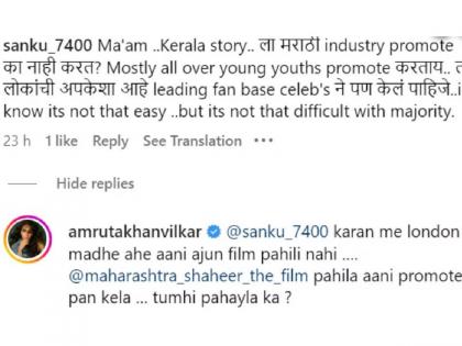 अभिनेत्री अमृता खानविलकर सध्या लंडनमध्ये सिनेमाचं शूट करत आहे. दरम्यान ती अनेक फोटोही सोशल मीडियावर अपलोड करत आहे. अशाच एका फोटोवर कमेंट करत चाहत्याने विचारलं, "मॅडम, द केरळ स्टोरीला मराठी इंडस्ट्री प्रमोट का करत नाही? बहुतांश सगळे तरुण पाठिंबा देत आहेत. यामुळे लोकांना अपेक्षा आहे की leading fan base असणाऱ्या सेलिब्रिटींनी पाठिंबा द्यायला पाहिजे. मला माहितीए हे तितकं सोपं नाही पण अवघडही नाही."
