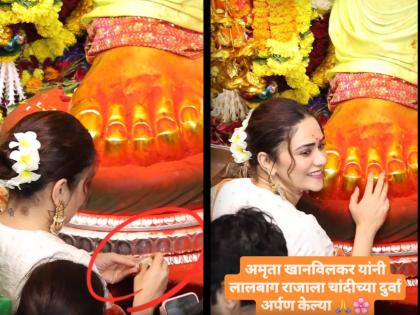 अमृताने नुकतंच राजाच्या दरबारात जाऊन लालबागचा राजाचं दर्शन घेतलं. यावेळी तिने साडी नेसून पारंपरिक लूक केला होता. लालबागचा राजाचं दर्शन घेतल्यानंतर अभिनेत्रीने बाप्पाच्या चरणी खास वस्तू अर्पण केली. अमृताने लालबागचा राजाला खास दान दिलं आहे. चांदीच्या दुर्वा अभिनेत्रीने बाप्पाच्या चरणी अर्पण केल्या. लालबागचा राजाच्या दर्शनावेळीचा अमृताचा व्हिडीओ सोशल मीडियावर व्हायरल झाला आहे.