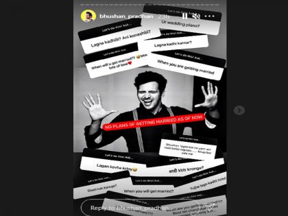 भुषणला मराठी चित्रपटसृष्टीतील मोस्ट एलिजेबल बॅचलर मानले जाते. त्यामुळे तो लग्न कधी करणार याची उत्सुकता त्याच्या फॅन्सना नेहमीच लागलेली असते. त्यामुळे भुषणला अनेक फॅन्सनी तू लग्न कधी करणार, तसेच कोणाशी करणार असे प्रश्न विचारले त्यावर सध्या तरी माझा लग्नाचा विचार नाहीये असे भुषणने उत्तर दिले. भुषणनेच त्याच्या फॅन्ससोबतच्या संवादाचा स्क्रीनशॉर्ट सोशल मीडियावर शेअर केला आहे.