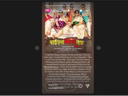विवेक अग्निहोत्रींनी त्यांच्या इन्स्टाग्राम स्टोरीमध्ये 'बाईपण भारी देवा' सिनेमासाठी खास पोस्ट शेअर केली आहे. ही पोस्ट शेअर करत त्यांनी या सिनेमाचं कौतुक केलं आहे. "मी काल 'बाईपण भारी देवा' सिनेमा पाहिला. असा सुंदर चित्रपट मी गेल्या कित्येक वर्षात पाहिलेला नाही. हा ऑस्कर विनिंग सिनेमा आहे. या सिनेमाला नॅशनल अवॉर्ड मिळायला हवा. उत्कृष्ट अभिनय, उत्तम लेखन आणि भावनिक विषयाचं योग्यरित्या केदार शिंदेंकडून केलेलं दिग्दर्शन. केदारने टायमिंग आणि प्रत्येक छोटी गोष्ट मास्टर असल्याप्रमाणे हाताळली आहे. रोहिनी हट्टांगडी, वंदना गुप्ते, सुकन्या मोने, शिल्पा नवलकर, सुचित्रा बांदेकर, दीपा चौधरी परब यांच्या कामासाठी माझ्याकडे शब्द नाहीत. या टीमला शुभेच्छा हा सिनेमा आताच पाहा आणि मला नंतर धन्यवाद द्या," असं विवेक अग्निहोत्रींनी पोस्टमध्ये म्हटलं आहे.