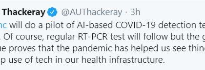 असे आम्ही नाही तर स्वतः शिवसेना नेते आदित्य ठाकरे यांनी म्हटले आहे. आदित्य यांनी ट्विट करत यासंदर्भात माहिती दिली आहे. आदित्य ठाकरेंनी ट्विट केले आहे, की 'बीएमसी आवाजाच्या नमून्याचा वापर करून AI-आधारित कोविड टेस्टिंगचे एक परीक्षण करेल. आरटी-पीसीआर टेस्टिंगदेखील होत राहील, मात्र, जगभरात टेस्ट केल्या गेलेले तंत्रज्ञानान हे सिद्ध करतात, की महामारीने आपल्याला वेगळ्यापद्धतीने विचार करायला आणि आरोग्यासाठी तंत्रज्ञानाचा वापर करायला मदत केली आहे.
