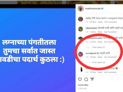 काही दिवसांपूर्वी मधुरा रेसिपीजच्या मधुरा बाचल यांनी इन्स्टाग्राममवर एक पोस्ट शेअर केली होती. या पोस्टमध्ये तुम्हाला लग्नाच्या पंगतीतला सर्वात जास्त आवडता पदार्थ कोणता असा प्रश्न विचारला होता. त्यावर अनेकांनी आपल्या आवडत्या पदार्थाचं नाव सांगितलं. मात्र, या सगळ्यात सुव्रतने केलेली कमेंट नेटकऱ्यांचं लक्ष वेधून घेत आहे.