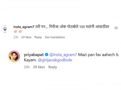 प्रियाने गुलाबी साडी परिधान केलेले फोटो पोस्ट केले होते. या फोटोखाली एका नेटकऱ्याने कमेंट केली की, ''तरी पन.... गिरीजा ओक गोडबोले १०० मतांनी आघाडीवर''. यावर प्रियाने रिप्लाय केला की, ''माझी पण फेव्हरेट आहे ती. कायम!'', अशाप्रकारे नेटकऱ्याला प्रियाला रिप्लाय दिलाय. एकूणच गिरीजा ओक 'नॅशनल क्रश' झाल्याचा आनंद प्रियाने व्यक्त केलाय. प्रिया आणि गिरीजा अनेक वर्षांपासून एकमेकींच्या चांगल्या मैत्रिणी आहेत. त्यामुळेच नेटकऱ्याने केलेल्या खोचक कमेंटला प्रियाने चांगलं उत्तर दिलंय.
