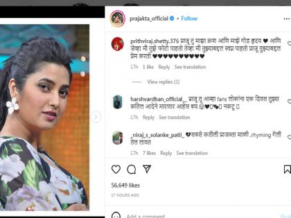 ‘आजच्या चित्राने मला वेड लावले प्राजु. मी तुझ्यावर खूप प्रेम करतो. प्रिय गोड हृदय... तुझे डोळे आहेत इतके सुंदर की मी तुझे डोळे बनून तुझ्या आयुष्याचा भाग बनू शकलो असतो,’ अशी कमेंट तिच्या एका चाहत्याने केली. ‘प्राजू तू माझा क्रश आणि माझे गोड हृदय... जेव्ही मी तुझे फोटो पाहतो तेव्हा मी तुझ्याबद्दल स्वप्न पाहतो प्राजू, तुझ्याबद्दल प्रेम करतो...,’असं एकाने लिहिलं.