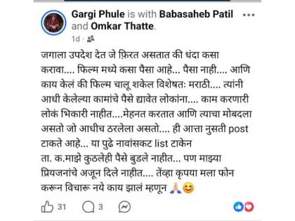गार्गी फुलेंनी शेअर केलेल्या फेसबुक पोस्टमध्ये असं म्हटलं आहे की "जगाला उपदेश देत जे फिकत असतात की धंदा कसा करावा, फिल्ममध्ये कसा पैसा आहे...पैसा नाही आणि काय केलं की फिल्म चालू शकेल विशेषत: मराठी...त्यांनी आधी केलेल्या कामांचे पैसे द्यावेत लोकांना...काम करणारे लोक भिकारी नाहीत. मेहनत करतात आणि त्याचा मोबदला असतो जो आधीच ठरलेला असतो. ही आता नुसती पोस्ट टाकतेय...यापुढे नावासकट लिस्ट टाकेन... ता.क. माझे कुठलेही पैसे बुडले नाहीत. पण माझ्या प्रियजनांचे अजून दिले नाहीत. तेव्हा कृपया मला फोन करून विचारू नये काय झालं म्हणून..". गार्गी फुलेंचं मानधन किंवा कामाचे पैसे बुडालेले नाहीत. मात्र त्यांनी त्यांच्या मित्रपरिवारातील काही व्यक्तींसाठी ही पोस्ट शेअर केली आहे.