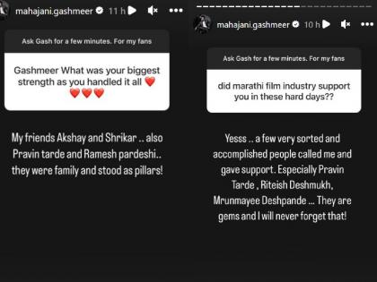 गश्मीरने इन्स्टाग्रामवर 'आस्क गश' हे सेशन घेतले. यावेळी चाहत्यांनी त्याला या कसा आहेस? या कठीण प्रसंगाला कसं सामोरं जात आहेस? परत काम कधी सुरु करणार? असे अनेक प्रश्न विचारले. तर एका चाहत्याने प्रश्न केला की,' या कठीण प्रसंगात मराठी फिल्म इंडस्ट्रीतून कोणी साथ दिली का? यावर गश्मीर म्हणाला, 'हो...काही अतिशय कुशल लोकांनी मला फोन केला आणि पाठिंबा दिला. विशेषत: प्रविण तरडे, रितेश देशमुख, मृण्मयी देशपांडे..हे लोक तर रत्न आहेत आणि मी त्यांचे ऋण कधीच विसरणार नाही.