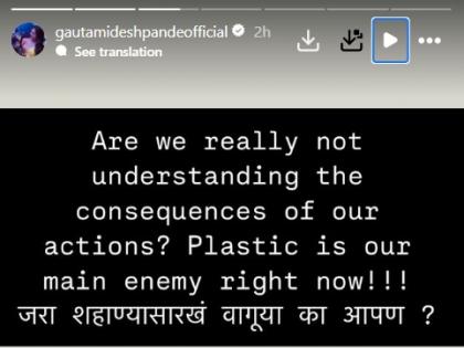 गौतमीनं इन्स्टाग्रामवर स्टोरी शेअर करत लिहलं, "आपल्या कृतीचे परिणाम आपल्याला खरोखरच कळत नाहीत का? प्लास्टिक हा सध्या आपला मुख्य शत्रू आहे! जरा शहाण्यासारखं वागूया का आपण?". तिची ही पोस्ट सध्या चर्चेत आहेत. गौतमी देशपांडे सोशल मीडियावर कायमच सक्रीय असते. सोशल मीडियावर ती आपल्या अनेक फोटो व व्हिडीओ शेअर करते, तसेच सामाजिक विषयांवर ठामपणे मत मांडताना पाहायला मिळते.