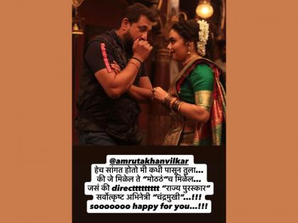 ६० आणि ६१ महाराष्ट्र राज्य चित्रपट पुरस्कार सोहळा नुकताच पार पडला. या सोहळ्यात अनेक कलाकारांना गौरविण्यात आले. या सोहळ्यात अभिनेत्री अमृता खानविलकर( Amruta Khanvilkar)ला चंद्रमुखी (Chandramukhi Movie) सिनेमासाठी उत्कृष्ट अभिनेत्रीचा पुरस्कार मिळाला. या चित्रपटाचे दिग्दर्शन प्रसाद ओक(Prasad Oak)ने केले आहे. हा पुरस्कार अमृताला मिळाल्यानंतर प्रसादने सोशल मीडिया इंस्टाग्राम स्टोरीवर पोस्ट शेअर केली आहे.