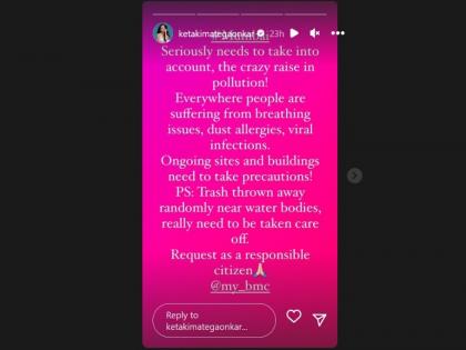 केतकीने तिच्या इन्स्टा स्टोरीमधून मुंबईच्या प्रदुषणाबद्दल भाष्य केलं आहे. "वाढत्या प्रदुषणाकडे गांभीर्याने पाहण्याची गरज आहे. नागरिकांना धूळीचे कण, इन्फेक्शन आणि श्वसनाचा त्रास होत आहे. बांधकाम सुरू असलेल्या ठिकाणांनी काळजी घेणं गरजेचं आहे. कचरा पाण्याच्या ठिकाणी फेकला जात आहे. याची काळजी घेतली गेली पाहिजे. एक जबाबदार नागरिक म्हणून मी मुंबई महानगरपालिकेला विनंती करत आहे," असं केतकीने पोस्टमध्ये म्हटलं आहे. केतकीने मुंबई महापालिकेलाही या स्टोरीमध्ये टॅग केलं आहे.