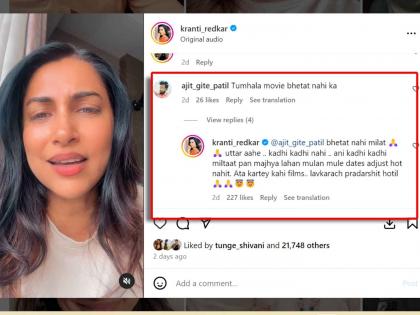 नुकतंच क्रांतीने तिच्या इन्स्टाग्रामवर एक व्हिडिओ शेअर केला होता. तिच्या या व्हिडिओवर कमेंट करत चाहत्याने क्रांतीला "तुम्हाला चित्रपट मिळत नाहीत का?" असा प्रश्न विचारला होता. चाहत्याच्या या प्रश्नाला क्रांतीने अगदी चोख पद्धतीने उत्तर दिलं. विशेष म्हणजे क्रांतीने या चाहत्याला त्याची व्याकरणातील चूकही दाखवून दिली. क्रांतीच्या व्हिडिओवर कमेंट करत चाहत्याने "तुम्हाला चित्रपट भेटत नाहीत का?" असा प्रश्न विचारला होता. या प्रश्नाचं उत्तर देताना क्रांतीने सर्वप्रथम त्याचं व्याकरण सुधारलं.