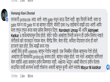 सरकारी प्रोटोकॉल आड आले. मला गेटमधून जाऊ दिलं नाही. खूप विनंती केली. मला या गेटवरून त्या गेटवर जा म्हणत राहिले. शेवटी एका पीएसआय साहेबांना माझी दया आली आणि त्यांनी मला लपून लपून कसाबसा प्रवेश मिळवून दिला. नंदेश उमप, मी आणि अभिजीत केळकर 4 वाजल्यापासून तिथं होतां. शेवटपर्यंत विनंती करूनही दर्शन मिळत नव्हतं. संगीताचे खरे वारसदार गायक शान, शैलेंद्र सिंग, बेला शेंडे, कविता पौडवाल यांनाही मागे हटकलं जात होतं, तिथे माझी काय गत.