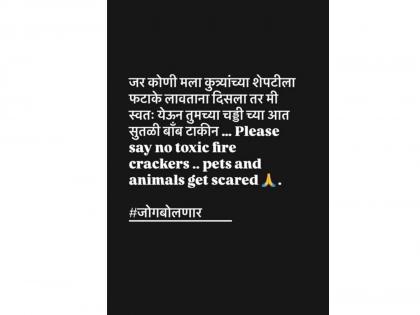 मराठी अभिनेतापुष्कर जोगने दिवाळीनिमित्त त्याच्या इन्स्टाग्रामवरुन एक पोस्ट शेअर केली आहे. या पोस्टमधून त्याने प्राण्यांशी गैरवर्तन करणाऱ्यांना आणि त्यांना त्रास देणाऱ्यांना थेट तंबी दिली आहे. "जर कोणी मला कुत्र्यांच्या शेपटीला फटाके लावताना दिसला तर मी स्वत: येऊन तुमच्या चड्डीच्या आत सुतळी बॉम्ब टाकेन...Pleased say no toxic fire crackers...pets and animals get scared", असं पुष्करने पोस्टमध्ये म्हटलं आहे. पुष्करची ही पोस्ट चर्चेत आहे.