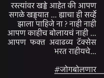 पुष्कर जोग हा सोशल मीडियावर प्रचंड सक्रिय असतो. #जोगबोलणार या हॅशटॅगसह पोस्ट शेअर त्याने करत आपलं मत मांडलं आहे. पुष्करने लिहिलं की, 'दरवर्षी तेच तेच...रस्त्यांवर खड्डे आहेत की आपण सगळे खड्ड्यात... ह्याचा ही सर्व्हे झाला पाहिजे ना? नाही नाही आपण काहीच बोलायचं नाही...आपण फक्त अवाढव्य टॅक्सेस भरत राहायचे...माणसांचा, लहान मुलांचा आणि महिलांचा जीव महत्वाचा आहे की नाही?'. त्यांची ही पोस्ट सध्या चर्चेत आहे.