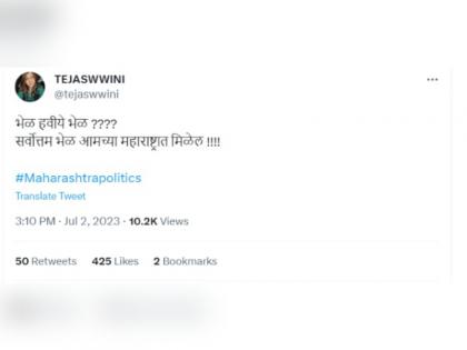 “भेळ हवीये भेळ ???? सर्वोत्तम भेळ आमच्या महाराष्ट्रात मिळेल !!!!” असं ट्विट तेजस्विनीने केलं आहे. सोबतच तिने Maharashtrapolitics हा हॅशटॅगही वापरला आहे. तिच्या या ट्विटवर नेटकऱ्यांनी तुफान कमेंट केल्या आहेत. लोकशाही फक्त नावापूरतीच, बाकी सालटं काढायचं काम सुरूच राहील, असं एका युजरने म्हटलंय.