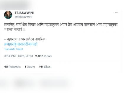 या ट्विटमध्ये तेजस्विनीने थेट मनसे अध्यक्ष राज ठाकरे यांना मुख्यमंत्री करा असं म्हटलं आहे. "तत्वनिष्ट, सार्वभौम विचार आणि महाराष्ट्रावर अपार प्रेम अश्याच माणसानं आता महाराष्ट्रावर “ राज” करावं !!! - महाराष्ट्राचा भरडलेला नागरिक महाराष्ट्रआतातरीजागाहो", असं दुसरं ट्विट तिने केलं आहे.