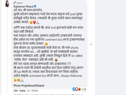 तुम्ही सर्वजण माझ्यावर एवढे प्रेम करता माझ्या सर्व पोस्ट तुम्हा सर्वांमुळे चर्चेत येतात, त्यासाठी मी तुम्हा सर्वांचे खरच मनापासून आभार मानते. आणि फक्त एवढेच सांगते की, मला ट्रोल झाल्याने काही एक फरक पडत नाही मित्रांनो. फक्त एवढाच जोर असेल, पुरुषत्व (मर्दानगी) दाखवायची जास्तच हौस असेल तर एका मुलीच्या कमेंट बॉक्स मध्ये दाखवण्यापेक्षा तुमच्या नेत्या समोर दाखवा.