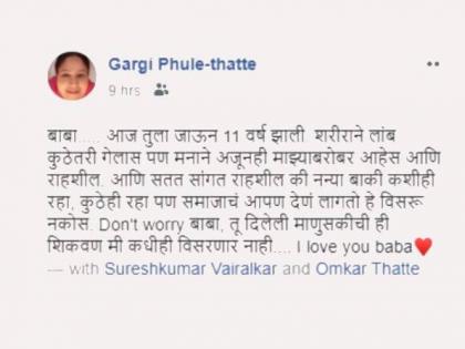 ‘बाबा... आज तुला जाऊन 11 वर्षे झाली. शरीराने लांब कुठेतरी गेलास पण मनाने अजूनही माझ्याबरोबर आहेस आणि राहशील आणि संतत सांगत राहशील की नन्या बाकी कशीही रहा, कुठेही रहा पण समाजाचं आपण देणं लागतो हे विसरू नकोस. डोन्ट वरी बाबा, तू दिलेली माणुसकीची ही शिकवण मी कधीही विसरणार नाही.... आय लव्ह यू बाबा,’ असे गार्गीने तिच्या पोस्टमध्ये लिहिले आहे.