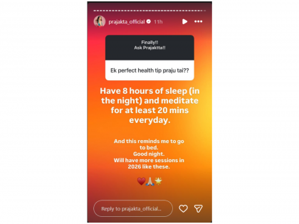 नुकतंच प्राजक्ताने इन्स्टाग्रामवर आपल्या चाहत्यांशी संवाद साधण्यासाठी एक 'आस्क मी सेशन' केले होते. यावेळी एका नेटकऱ्याने तिला विचारलेल्या प्रश्नावर प्राजक्ताने उत्तरे दिली. यावेळी एका चाहत्याने विचारलं, "प्राजक्ता ताई, तू मला एक परफेक्ट हेल्थ टिप देऊ शकतेस का?" यावर उत्तर देताना प्राजक्ताने दोन महत्त्वाच्या गोष्टी सांगितल्या. तिने सांगितले की, रात्री किमान ८ तासांची झोप घेणे शरीरासाठी अत्यंत महत्त्वाचे आहे. विश्रांतीशिवाय शरीर फिट राहू शकत नाही. यासोबतच मानसिक आरोग्यासाठी रोज २० मिनिटं ध्यान करण्याचा सल्लाही तिने दिला.