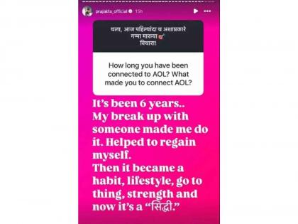 प्राजक्ता माळीने इन्स्टाग्रामवर 'आस्क मी' सेशन घेतलं. यात तिने चाहत्यांच्या प्रश्नांना उत्तरं दिली. दरम्यान एका चाहत्याने प्रश्न विचारला की, 'तू आर्ट ऑफ लिव्हिंगशी कधीपासून जोडली गेली आहेस? तुझा या संस्थेशी कसा संबंध आला?' या प्रश्नाचं उत्तर देताना प्राजक्ता लिहिते, "६ वर्षांपासून मी आर्ट ऑफ लिव्हिंगशी जोडली गेले आहे. एकासोबत ब्रेकअप झाल्यामुळे मी इकडे वळले. स्वत:ला पु्न्हा उभं करण्यासाठी मी आर्ट ऑफ लिव्हिंगमध्ये सहभागी झाले. मग मला याची सवयच झाली. ही माझी जीवनशैलीच बनली. काहीही झालं की कुठे जायचं त्यासाठी एक हक्काची जागा मिळाली, मला बळ मिळालं आणि आता हीच माझ्यासाठी 'सिद्धी' आहे."
