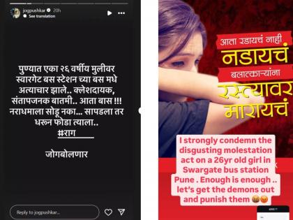 पुण्यातील स्वारगेट बस स्थानकात एका २६ वर्षीय तरुणीवर शिवशाही बसमध्ये बलात्कार करण्यात आल्याची धक्कादायक घटना समोर आली आहे. मराठी अभिनेता पुष्कर जोगदेखील भडकला आहे.