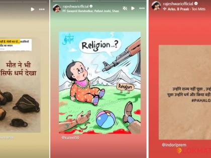 पहलगाम हल्ल्यातील गोळाबारात मृत्यू झाल्यानंतर लेफ्टनंटची पत्नी त्याच्या मृतदेहाजवळ बसून होती. या फोटोचा एआय जनरेटेड फोटोही राजेश्वरीने शेअर केलाय. त्या फोटोवर "मृत्यूनेही धर्म बघितला" असं लिहलेलं आहे. तर दुसऱ्या स्टोरीमध्ये तिनं एक बंदुकधारी दहशतवादी एका छोट्या बाळाला धर्म विचारतानाचं व्यंगचित्र शेअर केलंय. तर आणखी एका स्टोरीमध्ये राजेश्वरीनं "त्यांनी हल्ला करताना राज्य, भाषा नाही विचारली तर धर्म विचारला" असं लिहलेला फोटो पोस्ट केलाय.