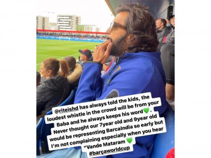 जिनिलियाने रितेशचा फोटो पोस्ट केला आहे. यामध्ये तो प्रेक्षकांमध्ये बसला असून शिट्टी वाजवत मुलांना चिअर करताना दिसतोय. ती लिहिते, "रितेश नेहमी मुलांना म्हणतो की प्रेक्षकांमधून सर्वात जोरात शिट्टी वाजवणारा तुमचा बाबाच असेल आणि तो नेहमीच तुम्हाला दिलेला शब्द पाळेल. इतक्या लवकर आपला ७ वर्षांचा आणि ९ वर्षांचा मुलगा इतक्या प्रतिष्ठित फुटबॉल टीमचं प्रतिनिधित्व करतील असा मी विचारही केला नव्हता. पण मी तक्रार करत नाहीए विशेषकरुन जेव्हा तुम्ही वंदे मातरम ऐकता."