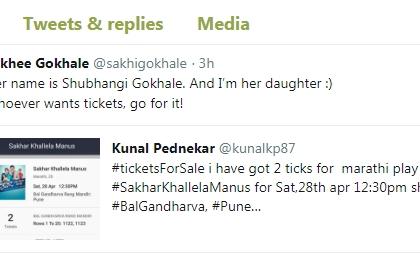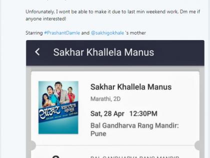 क ाकारांची मुलं आणि मुलं अभिनय क्षेत्रात पाऊल ठेवणं ही काही नवी गोष्ट नाही. आम्ही चालवू हा पुढे वारसा म्हणत चित्रपटसृष्टीतील कलाकारांची मुलं मुली या क्षेत्रात येतात. हिंदी, मराठी चित्रपटसृष्टीत अशी कलाकारांच्या मुला-मुलींची उदाहरणं आहेत. आपल्या आई वडिलाप्रमाणे स्वतःच्या अभिनयाने त्यांनी चित्रपटसृष्टीत वेगळी ओळख निर्माण केली आहे. अशाच स्टार किड्सपैकी एक म्हणजे अभिनेत्री सखी गोखले. दिवंगत अभिनेता मोहन गोखले आणि प्रसिद्ध अभिनेत्री शुभांगी गोखले यांची कन्या असलेल्या सखीने अल्पावधीतच स्वतःची वेगळी ओळख निर्माण केली आहे. दिल, दोस्ती, दुनियादारी या मालिकेतून घराघरात पोहचलेल्या सखीने स्वतःची वेगळी ओळख निर्माण केली आहे. सध्या सखी अमर फोटो स्टुडिओ या नाटकातही ती काम करत आहे. याशिवाय 'दिल दोस्ती दोबारा','रंग्रेज', 'तुकाराम' या सिनेमात भूमिका साकारल्या आहेत. आपल्या यशाचे श्रेय सखी कायमच आपल्या पालकांना विशेषतः आपली आई शुभांगी गोखले यांना देते. तिने अनेकदा आपल्या आईचं आपल्या जीवनात किती मोलाचं स्थान आहे हे जाहीररित्या सांगितलं आहे.याचीच प्रचिती पुन्हा एकदा सोशल मीडियावर आली आहे.एका नाट्य रसिकाकडे साखर खाल्लेला माणूस या नाटकाची दोन तिकीटे होती. या नाटकात प्रशांत दामले आणि शुभांगी गोखले यांची प्रमुख भूमिका आहे. मात्र काही कामामुळे या नाट्य रसिकाला या नाटकाला जाणं शक्य नसल्याने तसं ट्विट त्याने केले. प्रशांत दामले आणि सखी गोखलेच्या आईची भूमिका असणा-या नाटकाची दोन तिकीटे आहेत. कुणाला हवी असल्यास संपर्क करणे असं ट्विट त्याने केले. याच ट्विटला सखीने उत्तर दिले आहे. या ट्विटमधील सखीची आई यावर तिने या नाट्य रसिकाला उत्तर दिले आहे. त्या अभिनेत्रीचे नाव शुभांगी गोखले आणि मी त्यांची मुलगी. कुणाला तिकीटं हवं असल्यास घ्या असं उत्तर तिने ट्विट करुन दिले आहे.