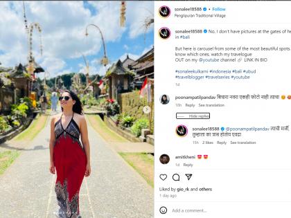 सोनाली सध्या बालीमध्ये असून व्हॅकेशन एन्जॉय करत आहे. या ट्रीपचे काही फोटो तिने सोशल मीडियावर शेअर केले. यावर पूनम पाटील पांडव नावाच्या युजरने "बिचारा नवरा एकही फोटो नाही त्याचा',अशी कमेंट करुन ट्रोल केलं. या कमेंटला सोनालीनं रिप्लाय दिला आहे. ती म्हणाली,'त्याची मर्जी, तुम्हाला का त्रास होतोय एवढा?'. सोनालीच्या या रिप्लायनं अनेकांचे लक्ष वेधले आहे.