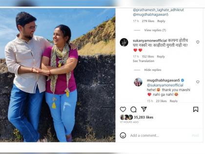कल्पना होतीच पण नक्की ना! काहीतरी गुगली नाही ना? अशी कमेंट सुकन्या मोने यांनी केली आहे. यावर मुग्धानेही होकार देत बातमी खरी असल्याचं सांगितलं. धन्यवाद मावशी...नाही गं नाही, असं म्हणत मुग्धाने प्रथमेशसोबत असलेल्या नात्यावर शिक्कामोर्तब केला.
