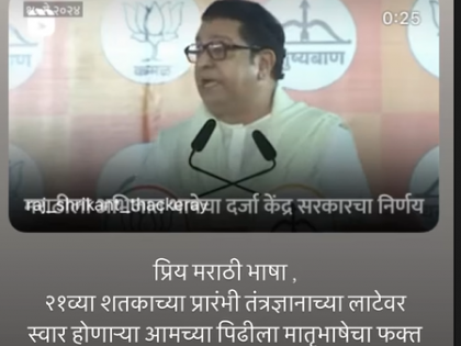 तेजस्विनी पंडितने सोशल मीडियावर राज ठाकरेंचा एक व्हिडीओ शेअर केला आहे. या व्हिडीलो दिलेल्या कॅप्शनमध्ये तिने मराठीला अभिजात भाषेचा दर्जा मिळवण्यासाठी राज ठाकरेंच्या प्रयत्नाचं कौतुक केलं. तिने लिहलं, "मराठी भाषा आणि महाराष्ट्राचे राखणदार... प्रिय मराठी भाषा, २१ शतकाच्या प्रारंभी तंत्रज्ञानाच्या लाटेवर स्वार होणाऱ्या आमच्या मातृभाषेचे फक्त जाज्वल्य नाही तर हृदयस्थ अभिमान कसा बाळगायचा ते आम्हाला या माणसाने शिकवलं. राजसाहेब", या शब्दात तिने राज ठाकरेंचे कौतुक केलं.