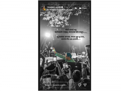 तेजस्विनीने राज ठाकरे यांचा एक रुबाबदार फोटो आपल्या सोशल मीडिया स्टेटसवर ठेवला आहे. या फोटोला तिने अतिशय अर्थपूर्ण अशा गाण्याच्या ओळींचे कॅप्शन दिले आहे. "मोठी लढाई लढू... मातीसाठी रं गड्या... मनगटाचा जोर लावून... तू आभाळ आभाळ, वादळ तुझं तू राजा... आसमानीच बळ दावजी…".या ओळींमधून तिने राज ठाकरे यांच्या नेतृत्वावर आपला विश्वास व्यक्त केला आहे.